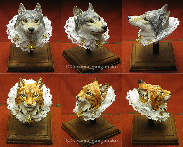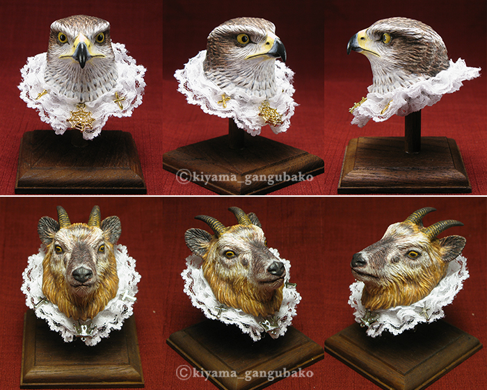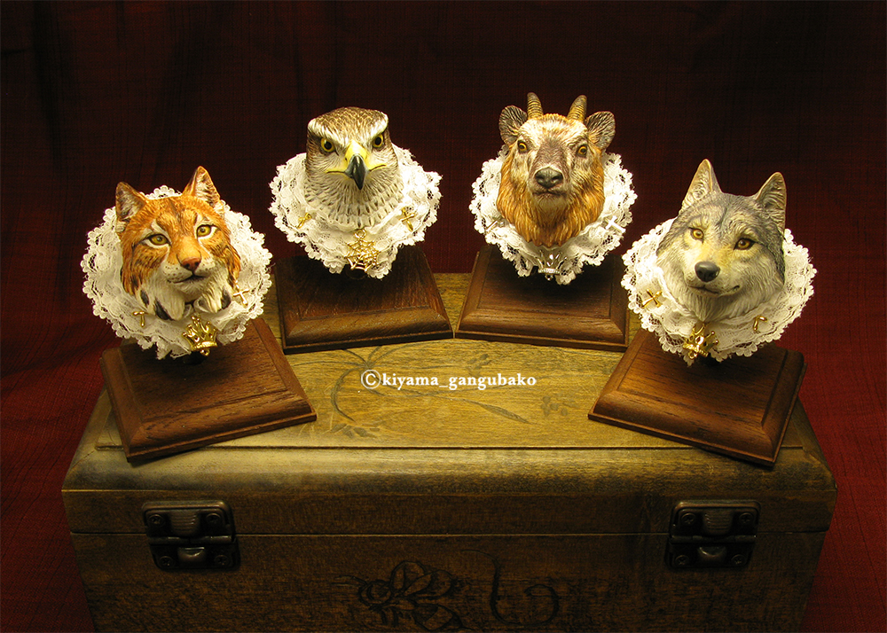 オオカミ・オオヤマネコ・オオタカ・二ホンカモシカの4種。石粉粘土で制作。一点物。