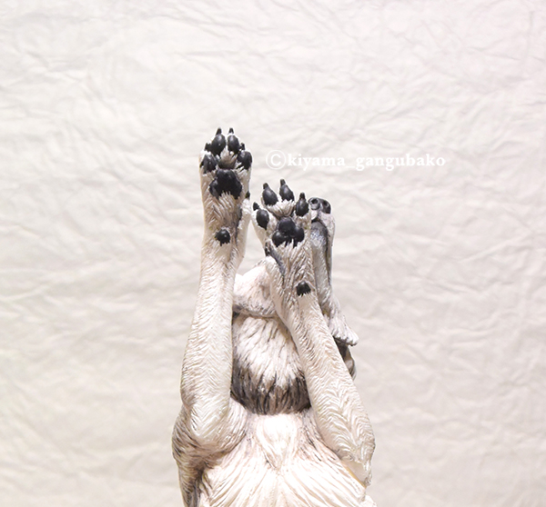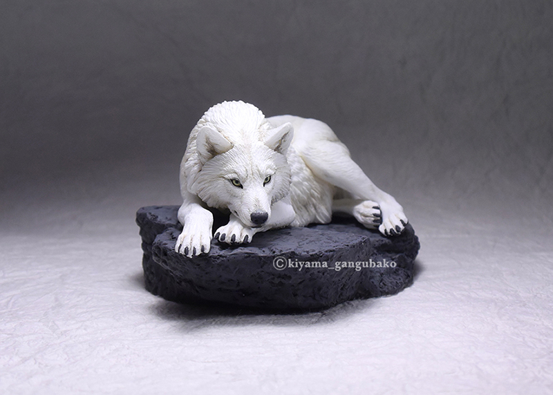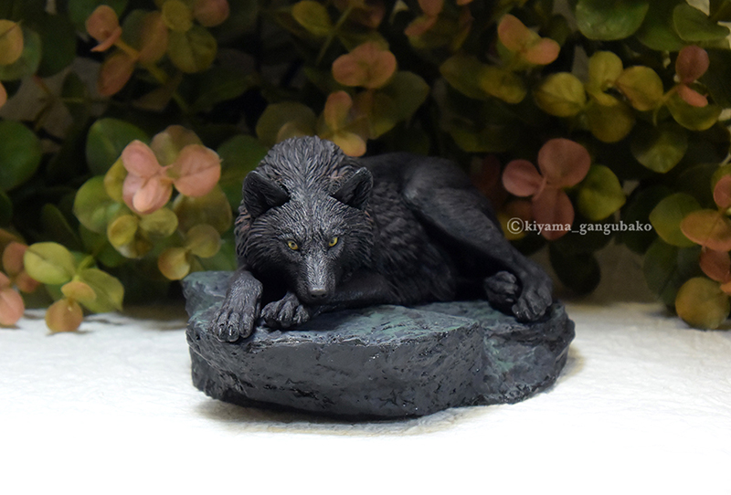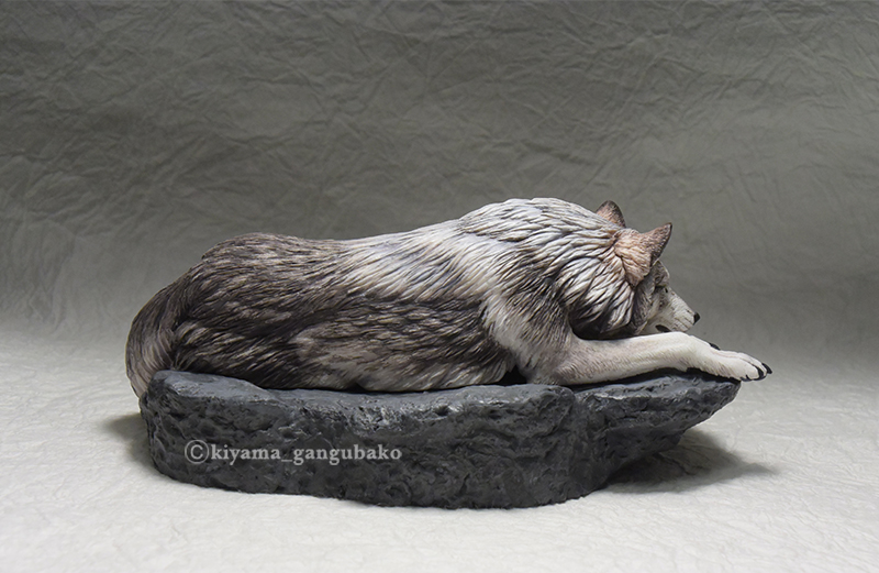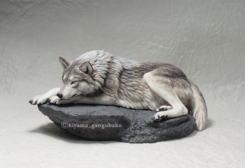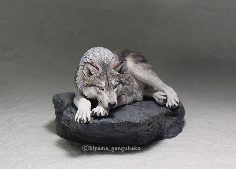 伏せの姿勢で寝そべるオオカミです。黒と白の色違い有り。